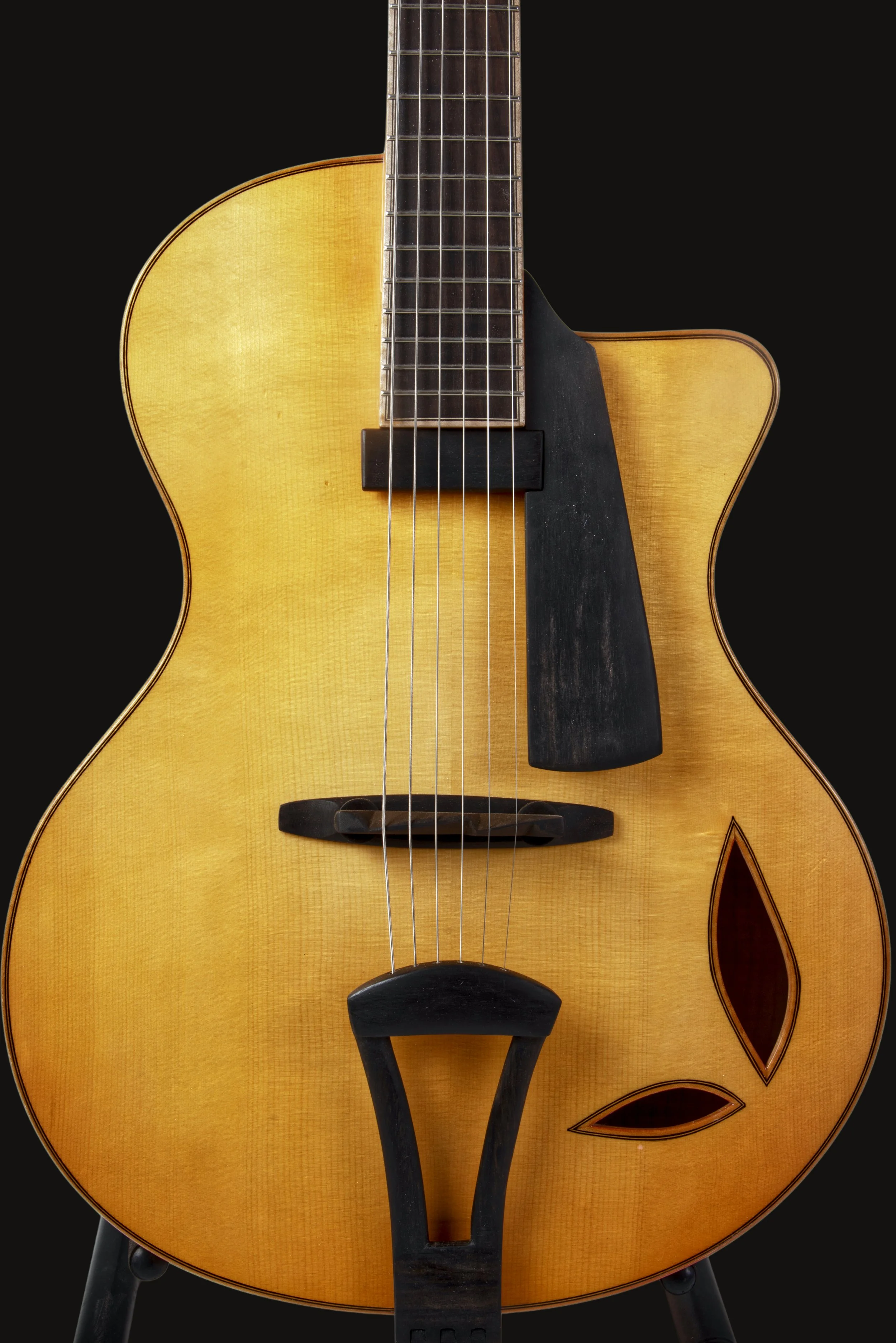 Built with fully carved plates and traditional floating electronics, the instrument preserves the resonance, projection, and dynamic response that defined the great carved archtops of the twentieth century.